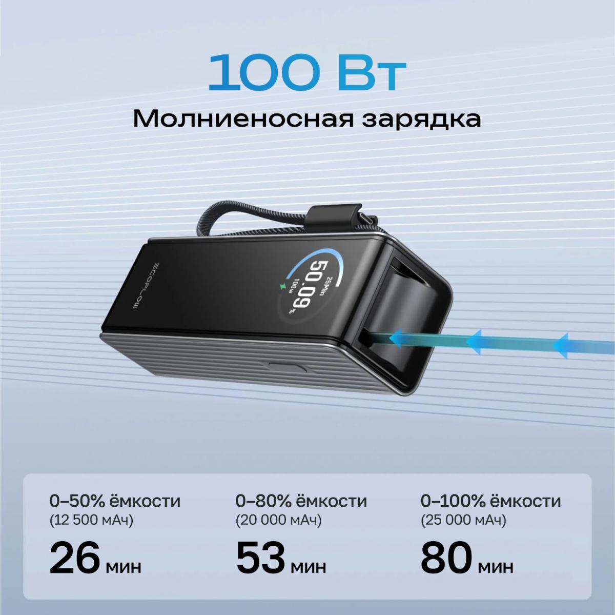 Нужно быстро зарядить повербанк перед поездкой или полетом? Он восстанавливает 50% заряда всего за 26 минут — этого хватит на две полные зарядки телефона или быструю подзарядку ноутбука, чтобы хватило на целый день.